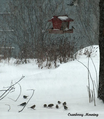 What a nice view you have, err.. that'll be in July. It looks like a snowstorm with some of those pictures and I don't blame you for taking it from behind the building.. it gives it an extra feeling of warmth. Like you, I always seem to be more observant in winter of birds. They seem much more carefree and absent in summer.
